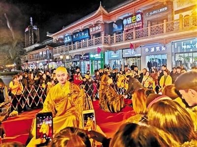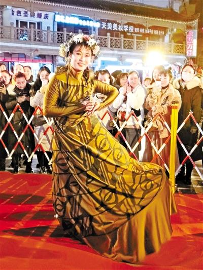當晚7時許,途經(jīng)表演現(xiàn)場的人流從四面八方聚攏于此,人們頻頻舉起手機將鏡頭對向眼前裙袂飛揚、舞姿優(yōu)美的“大地灣女神”和頷首微笑、靜若處子的“東方微笑”,一時間,閃光燈忽明忽暗此起彼伏,行人你來我往人聲鼎沸,步行街頃刻間歡聲笑語、熱鬧非凡。記者發(fā)現(xiàn),扮作“不倒翁”的“女神”模仿大地灣出土的人頭瓶外部特征,而一旁采用懸浮藝術(shù)呈現(xiàn)的“小沙彌”,打禪靜坐、頷首微笑。