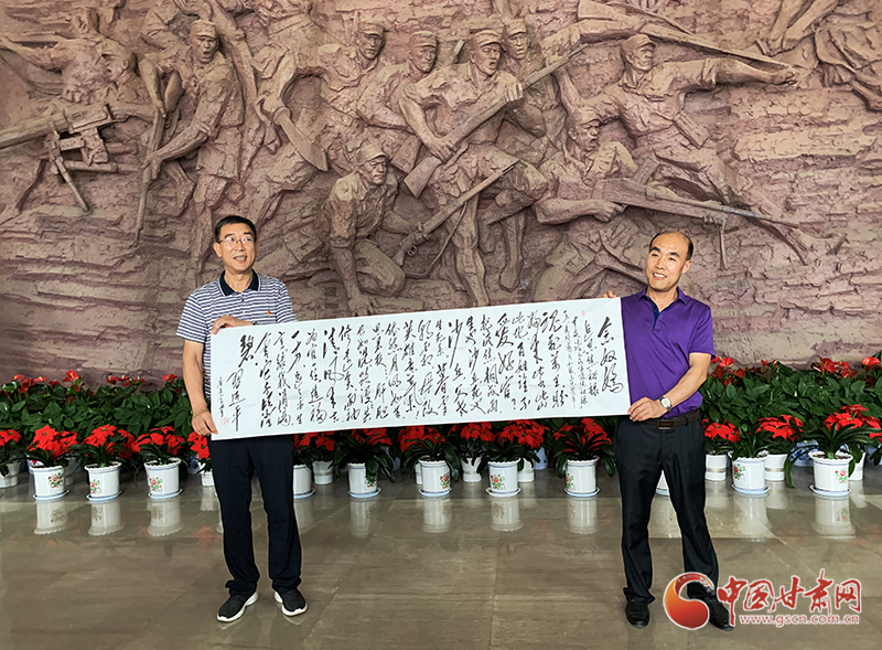 當(dāng)天,“追尋紅色足跡 弘揚延安精神”——紀念中央紅軍長征到達甘肅85周年調(diào)研采訪團一行,還參觀了兩當(dāng)兵變舊址及全國青少年教育基地。省延安精神研究會副會長張富奎向兩當(dāng)兵變紀念館贈送了毛體書法作品。