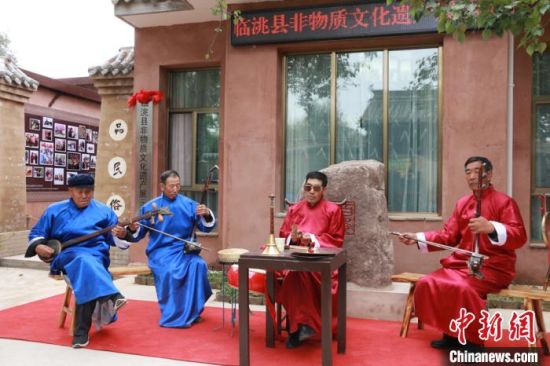 10月12日,甘肅省定西市臨洮縣舉行非物質(zhì)文化遺產(chǎn)展示中心啟動儀式。圖為當?shù)仄び皯騻鞒腥粟w學(xué)兵(右二)帶領(lǐng)班社表演影子腔?!堟?nbsp;攝