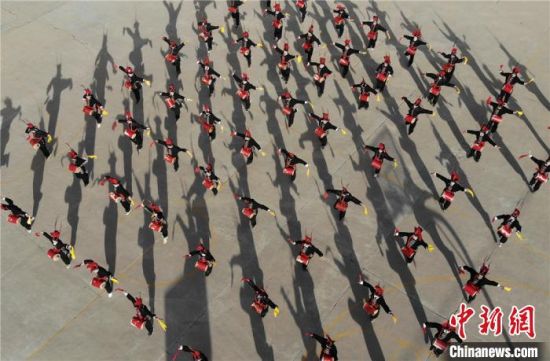 圖為甘肅武威市涼州區(qū)四壩鎮(zhèn)九年制學(xué)校的學(xué)生練習(xí)攻鼓子。 楊艷敏 攝