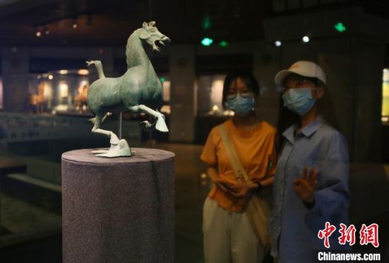 2020年5月18日,游客參觀銅奔馬。當天是國際博物館日,游客來到位于甘肅蘭州的甘肅省博物館有序參觀,感受絲路文明。(資料圖) 高展 攝