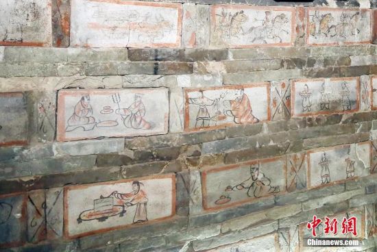 位于甘肅嘉峪關(guān)市的嘉峪關(guān)新城魏晉墓群,內(nèi)有千余座魏晉古墓,從1972年起,先后發(fā)掘18座,其中9座為畫像磚墓。磚壁畫取材于現(xiàn)實生活,用連環(huán)畫的方式反映出了當(dāng)時河西地區(qū)生活、生產(chǎn)、軍事、文化的真實情景,具有濃厚的生活氣息。目前只開放的六號墓,其壁畫內(nèi)容豐富,具有很強的代表性。高展 攝