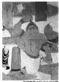 這幅壁畫講了這樣一個(gè)故事:外道勞度叉,約佛教弟子舍利弗斗法,失敗的一方要么選擇自盡,要么放棄原有的信仰而皈依佛門。經(jīng)過一番殊死搏斗,失敗后的外道,向舍利弗投降跪拜。