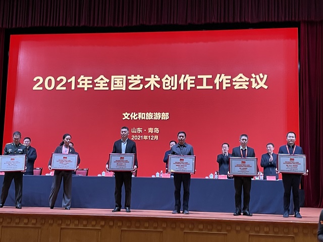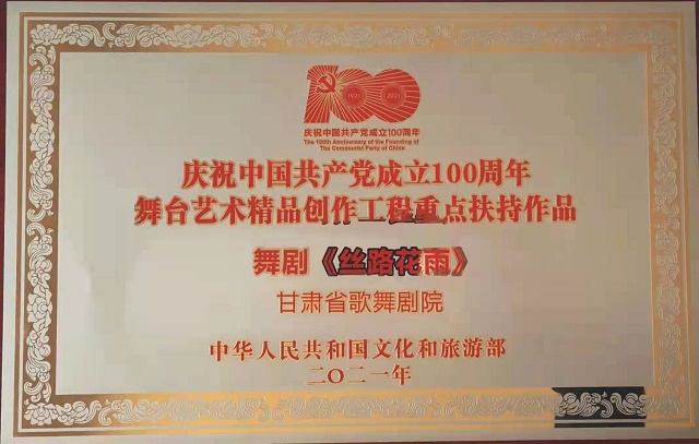 中國甘肅網(wǎng)12月19日訊 12月18日,文化和旅游部在山東省青島市召開的“2021年全國藝術(shù)創(chuàng)作工作會議”上,發(fā)布了“慶祝中國共產(chǎn)黨成立100周年舞臺藝術(shù)精品創(chuàng)作工程”入選名單,頒發(fā)了“慶祝中國共產(chǎn)黨成立100周年舞臺藝術(shù)精品創(chuàng)作工程獎(jiǎng)牌”。甘肅省文化和旅游廳遴選推薦的舞劇《絲路花雨》《大夢敦煌》《彩虹之路》、隴劇《官鵝情歌》、小品《你笑起來真好看》等5部舞臺藝術(shù)精品,經(jīng)文旅部評審正式入選“舞臺藝術(shù)精品創(chuàng)作工程重點(diǎn)扶持作品”。甘肅省歌舞劇院創(chuàng)排的舞劇《絲路花雨》作為12家“百年百部”工程受獎(jiǎng)單位在全國藝術(shù)創(chuàng)作工作會議上接受獎(jiǎng)牌和榮譽(yù)證書,甘肅省文旅廳、山東省文旅廳等參會代表12家領(lǐng)獎(jiǎng)單位上臺領(lǐng)獎(jiǎng),充分展現(xiàn)了文旅部對甘肅省入選作品質(zhì)量及組織工作的高度肯定。