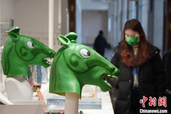 圖為“神馬來了”銅奔馬頭套吸引參觀者駐足?!【琶赖┰?攝