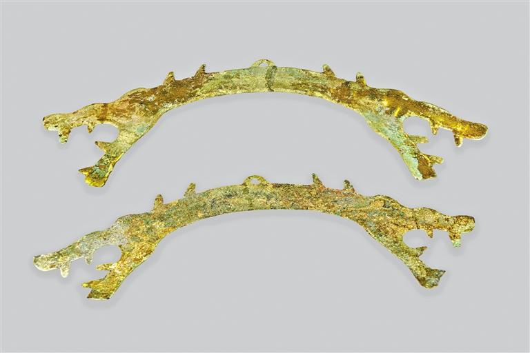 此套鎏金龍虎飾件中的虎飾件:長(zhǎng)36.1厘米,寬9厘米;龍飾件:長(zhǎng)41厘米、寬7.7厘米。為春秋戰(zhàn)國(guó)時(shí)期龍、虎形銅璜,圓拱形,頂部之上有拱形穿,兩端分別為龍首與虎首,口部張開(kāi),露出尖牙。在新石器時(shí)代,璜一般是佩戴于胸頸部的裝飾品,具有象征身份地位的作用。