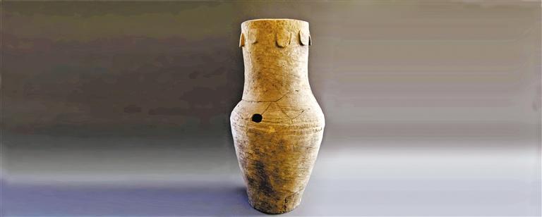 繩紋灰陶鼓直頸、鼓腹、平底,器型碩大,口徑30厘米,通高87厘米,地徑27厘米,是新石器時(shí)代馬家窯文化時(shí)期馬家窯類(lèi)型。