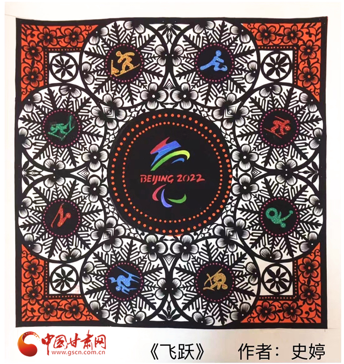 “剪紙是中國(guó)傳統(tǒng)文化,也是我的特長(zhǎng),所以我就用剪紙的形式創(chuàng)作了這兩幅《冬夢(mèng)》《飛躍》”。時(shí)值冬奧會(huì)在北京盛大開幕,史婷以冬奧會(huì)和冬殘奧會(huì)的會(huì)微為主題,加上一些比賽項(xiàng)目的標(biāo)志,創(chuàng)作了兩幅剪紙藝術(shù)作品。“我想通過作品為奧運(yùn)健兒們加油助力,希望他們?cè)诒荣愔心苋〉酶玫某煽?jī)。”她說。