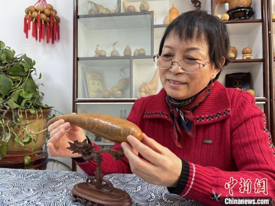 圖為長(zhǎng)約二十公分的長(zhǎng)條葫蘆雕刻佛教經(jīng)文作品。 張婧 攝