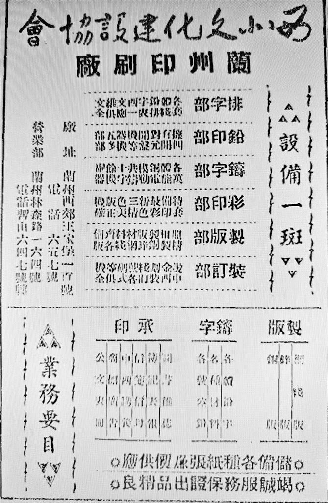 個別有實力的印刷廠也通過廣告拓展業(yè)務。如創(chuàng)辦于1947年9月的西北文化建設協(xié)會蘭州印刷廠是當時甘肅規(guī)模較大的印刷廠之一,曾印制過《蘭州古今注》《花兒集》《西北論叢》《新光》等書刊。據(jù)當年廣告所載,該廠內(nèi)設排字部、鉛印部、鑄字部、彩印部、制版部、裝訂部,承印范圍亦頗廣,包括圖書雜志、傳記表報、信箋信封、中西講義、商標廣告、公文表格等。
