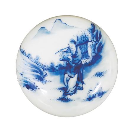 一件是青花印泥盒,制作于20世紀(jì)初。直徑7厘米,高3厘米,盒身扁圓,鼓腹,上下相合。盒蓋用青花繪“樵夫讀書”圖。畫面遠(yuǎn)處,兩座山峰高聳云間,四周樹木蔥蘢,山石嶙峋。畫面正中的山路上,一樵夫砍柴歸來,身背一大捆柴草,他右手扶著木棍,左手則捧著一本書,雙眼盯著書本,緊抿嘴唇,正津津有味地邊走邊讀。讀到精彩處,露出會(huì)心一笑??磥?,這個(gè)樵夫是極愛讀書的,這種好學(xué)精神,難道不值得我們學(xué)習(xí)嗎?這件瓷印泥盒,青花色澤典雅,人物衣褶神態(tài)描繪細(xì)致,栩栩如生,胎體堅(jiān)致,白釉溫潤,層次清晰,保存完好。