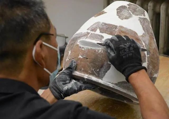 文物工作者對南佐遺址內(nèi)出土的陶器進行修復(8月25日攝)。新華社記者 李賀