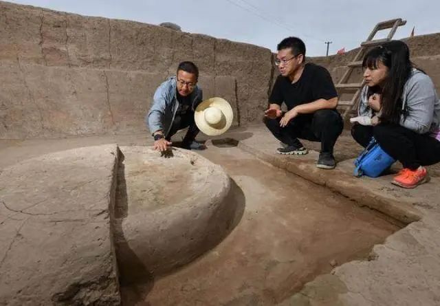 來自西北工業(yè)大學文化遺產(chǎn)研究院的考古隊員(左一)在南佐遺址核心區(qū)大型宮殿建筑發(fā)掘現(xiàn)場展示以“白灰面”鋪就的灶臺遺跡(8月23日攝)。新華社記者 李賀 攝