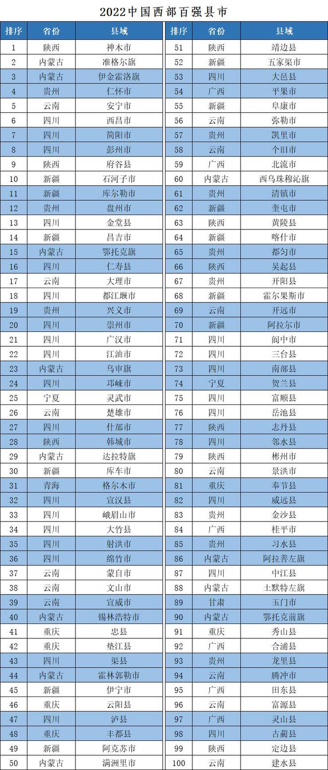 《中國西部地區(qū)縣域發(fā)展監(jiān)測報(bào)告》由競爭力智庫、北京中新城市規(guī)劃設(shè)計(jì)研究院等機(jī)構(gòu)聯(lián)合編制,監(jiān)測評價(jià)對象為西部12個?。ㄗ灾螀^(qū)、直轄市)的全部縣域單位,從經(jīng)濟(jì)規(guī)模、人民生活、經(jīng)濟(jì)活力、發(fā)展質(zhì)量等四個方面進(jìn)行評價(jià),四個分項(xiàng)指數(shù)合成競爭力指數(shù)。其中,縣(縣級市、自治縣、旗、自治旗、特區(qū))競爭力指數(shù)前100名為“中國西部地區(qū)綜合競爭力百強(qiáng)縣市”,簡稱“中國西部百強(qiáng)縣市”或“西部百強(qiáng)縣”;市轄區(qū)競爭力指數(shù)前100名為“中國西部地區(qū)綜合競爭力百強(qiáng)區(qū)”,簡稱“中國西部百強(qiáng)區(qū)”或“西部百強(qiáng)區(qū)”。今年,課題組在開展西部地區(qū)縣域發(fā)展監(jiān)測評價(jià)的基礎(chǔ)上,還聯(lián)合有關(guān)單位和專家,分區(qū)域、分類型總結(jié)了“2022中國西部地區(qū)縣域高質(zhì)量發(fā)展典型案例”,準(zhǔn)格爾旗、平果市、仁壽縣、彭州市、瀘縣、吳起縣、玉門市、開陽縣、大竹縣、彬州市、成都市雙流區(qū)、西安市雁塔區(qū)、昆明市官渡區(qū)、包頭市昆都侖區(qū)、克拉瑪依市克拉瑪依區(qū)、貴陽市觀山湖區(qū)、南寧市青秀區(qū)、蘭州市城關(guān)區(qū)、西寧市城西區(qū)、銀川市興慶區(qū)等20個縣(市、區(qū))入選典型案例名單,供全國交流學(xué)習(xí)。