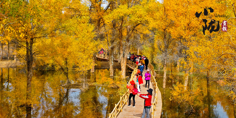漫步林中,就仿佛進入神話中的仙境。茂密的胡楊干奇百怪,神態(tài)萬般。粗壯、滄桑的胡楊幾個人難以合抱,挺拔的有七八丈之高,怪異的似蒼龍騰越、虬蟠狂舞。每一棵高大的樹冠枝頭,間或又有淺綠、淡黃的葉片在閃現,錯落有致,色彩繽紛,滿眼的赤橙黃綠與盈盈秋水互相映襯,令人嘆為觀止?!?/p>