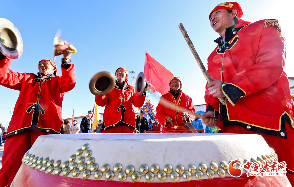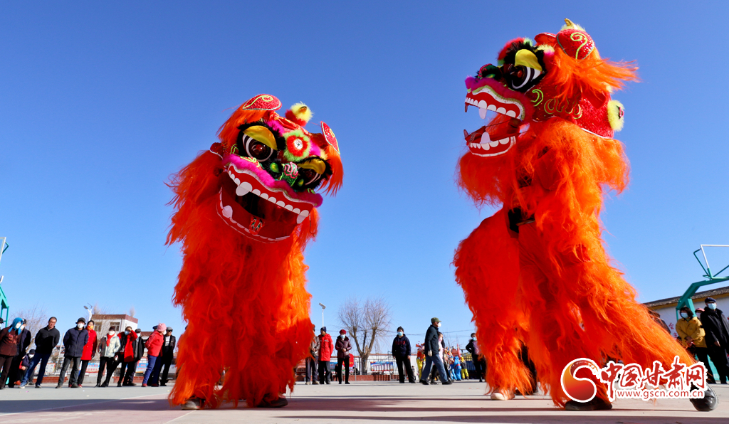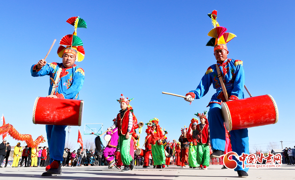 1月9日,甘肅省張掖市甘州區(qū)花寨鄉(xiāng)的社火表演隊(duì)正在文化廣場(chǎng)上加緊排練。