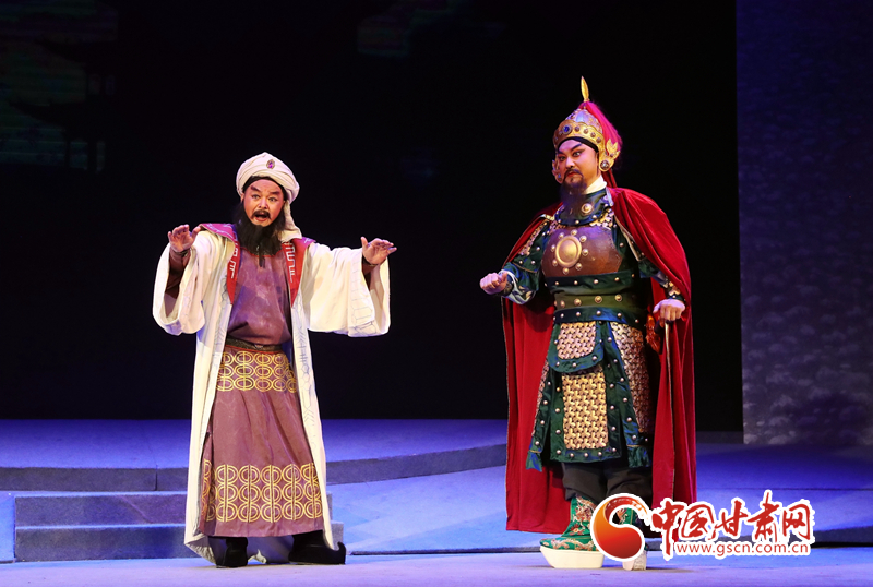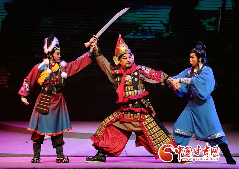 隴劇《敦煌》以回鶻族公主格麗莎的命運(yùn)軌跡為結(jié)構(gòu)框架和發(fā)展脈絡(luò),描繪了一幅炎黃子孫在血與火的洗禮中,保護(hù)中華民族文化的宏偉畫卷,充分詮釋了敦煌文化“美人之美”“美美與共”的開(kāi)放胸襟,“止戈為武”“協(xié)和萬(wàn)邦”的和平思想,“和為貴”“和而不同”的東方智慧以及“自強(qiáng)不息”的奮斗精神、“舍生取義”犧牲精神。