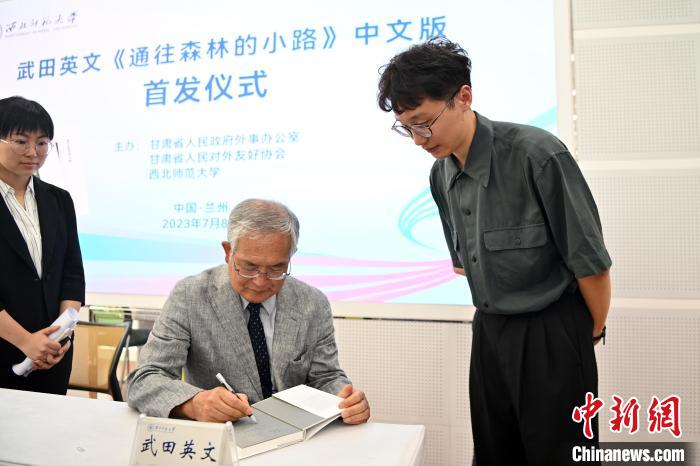 2023年7月8日,武田英文著作《通往森林的小路》中文版首發(fā)儀式在蘭州舉行。圖為武田英文給現(xiàn)場(chǎng)嘉賓簽名。 中新社記者 九美旦增 攝
