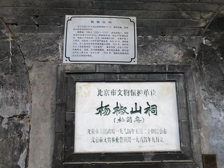 就是在這個(gè)胡同里,我看到一個(gè)歇山式屋頂?shù)姆课?,但已相?dāng)?shù)钠茢。蓓斏祥L滿了凄凄荒草,門窗皆已破爛不堪。但是門旁的墻壁上卻鑲嵌著一塊匾,近前一看,上面寫著“楊椒山祠”。喲,這就是楊椒山在北京的祠。