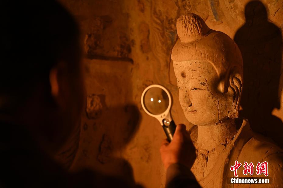 有時候看似簡單的佛像修復會遇到各類不同的文物病害,修復時間會長達三年之久,他也見證了文物修復技藝的變遷。隨著科技進步文物修復手段也變得越來越先進,他認為未來的文物保護工作一定會越來越好,年輕文保工作者們也一定會想盡更多辦法留住這座世界文化遺產(chǎn)。圖為8月25日,文物修復師牟常有正在仔細觀察佛像表面出現(xiàn)的病害問題。李亞龍 攝