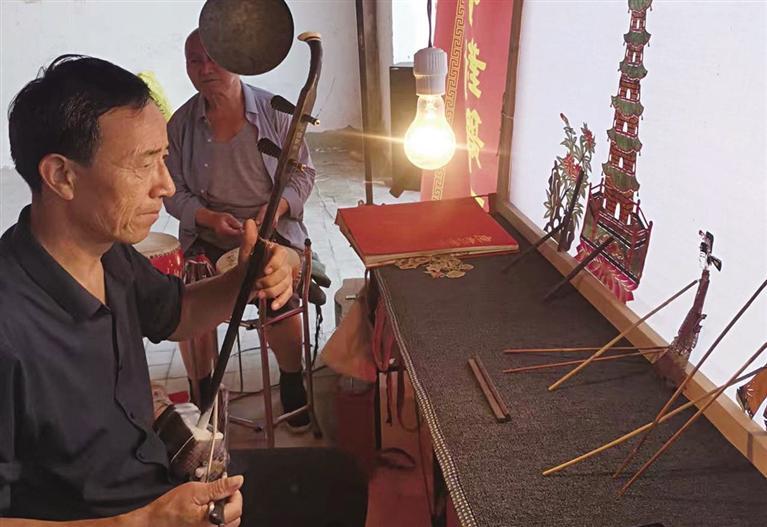 環(huán)縣道情皮影戲的價值主要體現(xiàn)在優(yōu)美獨特的道情音樂唱腔和精湛的皮影制作及表演上。戲班演出時,前臺一人挑扦表演,并承擔所有角色的坐唱念白,后臺四五人伴奏并“嘛簧”,一唱眾和,粗獷高亢,獨具風格。伴奏樂器中的四弦、漁鼓、甩梆子、簡板均為自制,音色獨特,傳唱劇目有180余部,至今還保留著“圖”“卷”等古老文化符號。