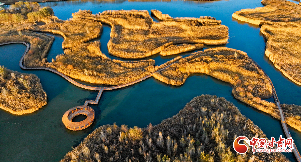 11月25日,在夕陽映照下的甘肅張掖黑河濕地國家級自然保護區(qū),金色繁茂的蘆葦長滿水面,碧水環(huán)繞其中,清風吹過,綠波蕩漾,成為市民和游客心曠神怡的好去處。