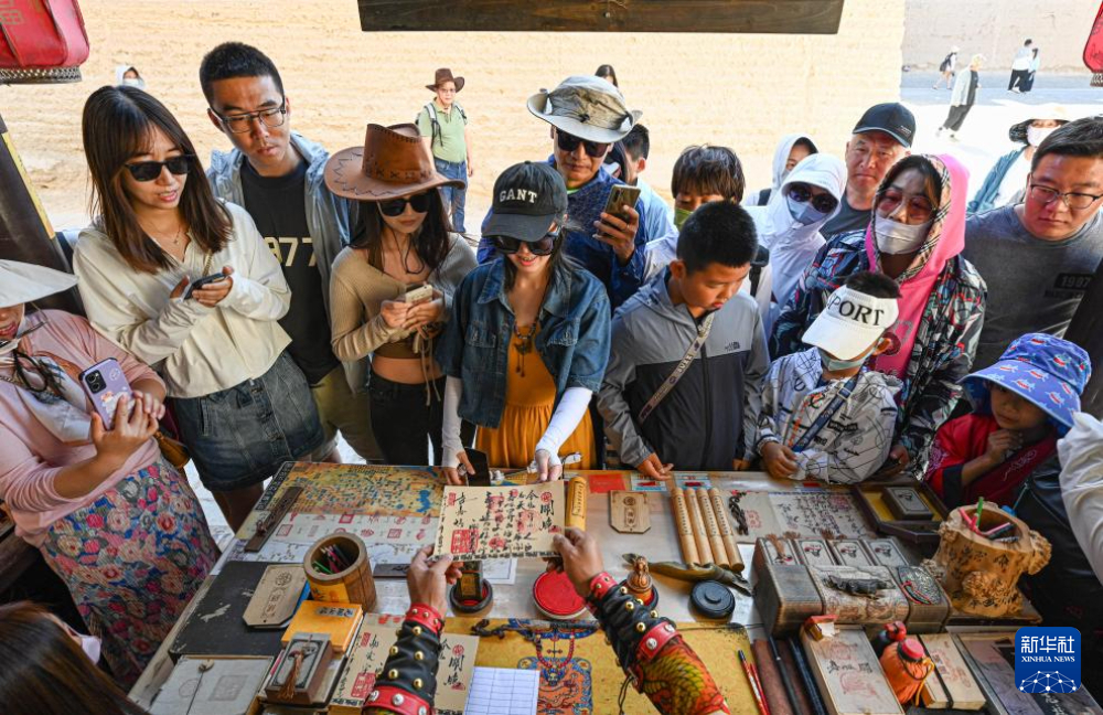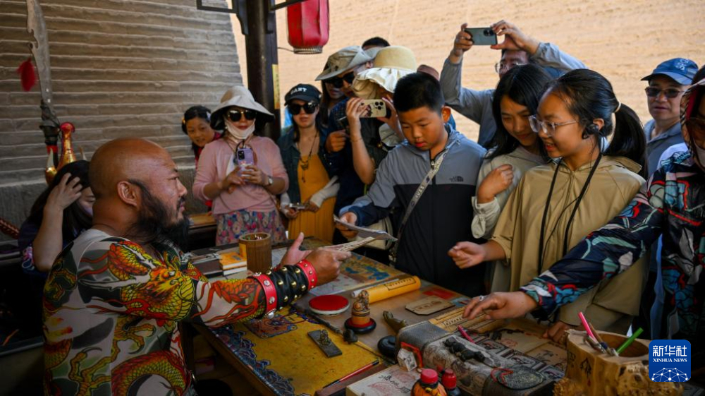 7月14日,在甘肅嘉峪關關城景區(qū),游客在李森的攤位前等待他“簽發(fā)關照”。新華社記者 陳鐘昊 攝