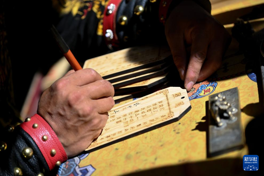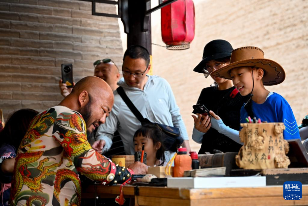 7月13日,在甘肅嘉峪關關城景區(qū),李森為游客手寫文創(chuàng)產(chǎn)品“關照”。新華社記者 劉金海 攝