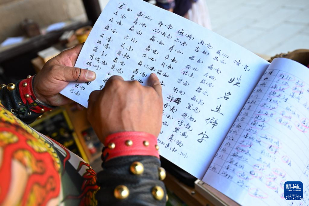 在甘肅嘉峪關關城景區(qū),李森在攤位上查閱自己編寫的含有生僻字讀音、城市古地名等內(nèi)容的小冊子(7月14日攝)。新華社記者 陳鐘昊 攝