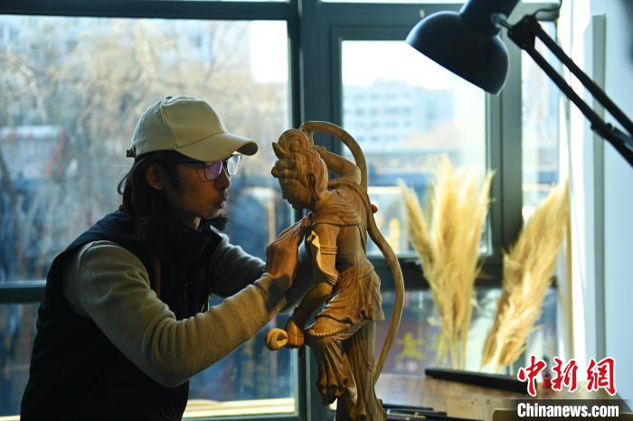 1月下旬,在甘肅蘭州技能人才服務(wù)產(chǎn)業(yè)園內(nèi),季茂杰進行敦煌元素的木雕創(chuàng)作。李亞龍 攝
