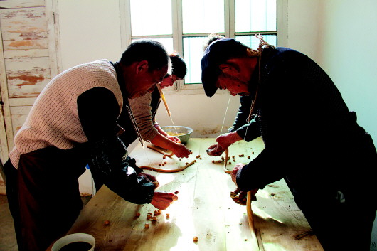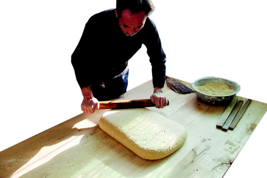 七十二行,釀酒、熬糖最繁瑣。香甜的麥芽糖,如同世間的其他事物一樣,都是通過(guò)勞苦換來(lái)的,正所謂苦盡甘來(lái)。田新民做灶糖用的是麥芽糖,首先要將原料小麥浸泡生芽,然后生成麥芽,不過(guò)有了麥芽,還要經(jīng)過(guò)多道工序才能變成麥芽糖。通常泡發(fā)麥芽之后,接下來(lái)就是蒸制配料,要依次進(jìn)行碾米、浸泡籠蒸、擠糖汁、二次籠蒸,再用力將麥芽搗碎,拌入蒸熟的黃米裝缸,加開(kāi)水浸泡,淋出第一遍糖汁,再加開(kāi)水淋出第二遍糖汁。然后再把兩次淋出的糖汁,倒至鐵鍋內(nèi)加小火,用木锨或木棒攪動(dòng),使水分蒸發(fā)凝結(jié)成固體,最終即得麥芽糖。熬糖要反復(fù)三次,經(jīng)過(guò)六個(gè)小時(shí)才能成功。田新民說(shuō):“這樣熬出來(lái)的糖,密封好后,埋在地下很多年都不會(huì)壞。”