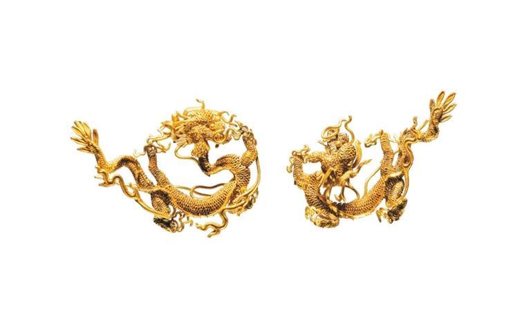 甘肅省博物館藏的明代累絲金龍,龍首聳額巨目,鬣發(fā)飛揚(yáng),神情兇猛;龍足屈伸相應(yīng),利爪如鉤;龍身似盤(pán)似舒,蜿蜒多態(tài);龍尾分叉,形狀如葉,輕輕擺動(dòng),飄帶般長(zhǎng)須刻畫(huà)出金龍瀟灑自由的雄姿。