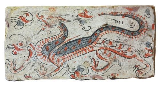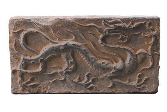 磚面上龍的形象棱角分明,骨架清瘦。龍身前屈后伸,起伏轉(zhuǎn)折,龍首高昂,張口吟嘯。前肢呈登騰狀,后肢做行進(jìn)狀。鬣鬃飛揚,揚爪攪尾,四爪如鷙,整條龍動態(tài)十足,形象逼真,為五代時期模印花磚中的精品。