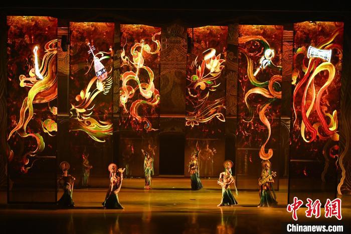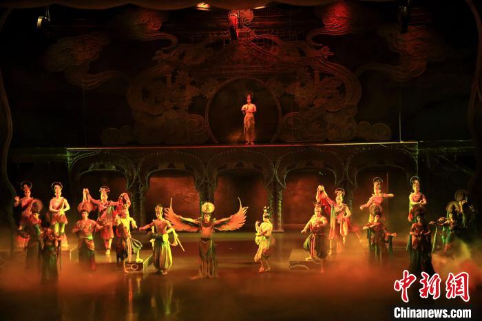 資料圖:2023年10月9日晚,演員在大型洞窟式沉浸體驗劇《樂動敦煌》中表演。張曉亮 攝