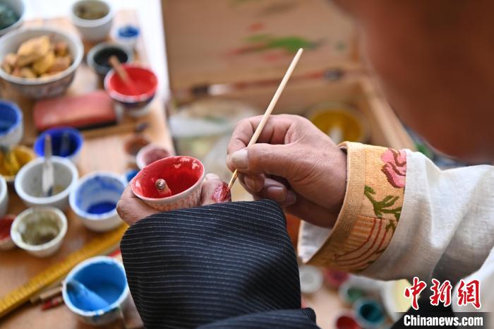 交巴加布的唐卡藝術(shù)之路始于童年。在父親的熏陶下,他從小就對唐卡藝術(shù)產(chǎn)生了濃厚的興趣。他不僅繼承其父親九麥的畫風(fēng)特點(diǎn),還不斷向其他畫師求教學(xué)習(xí),揣摩畫技,使自己的技藝更上一層樓。2024年2月,交巴加布在個人工作室內(nèi)調(diào)繪制唐卡所需的顏料。九美旦增 攝
