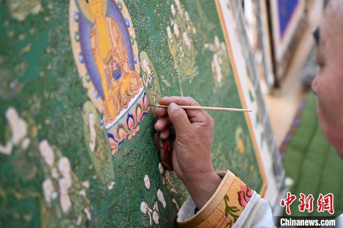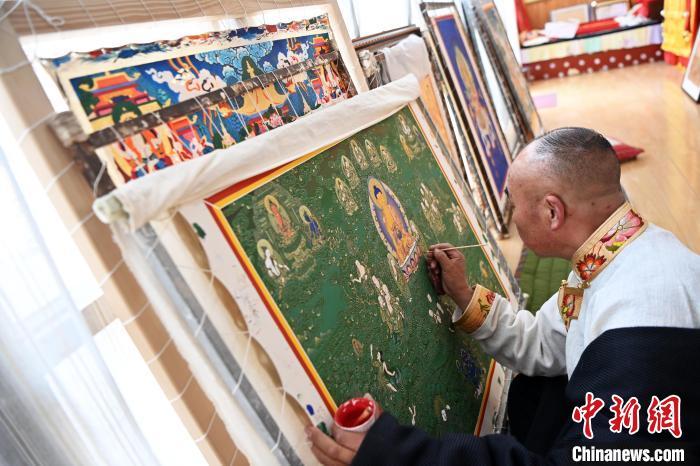 圖為交巴加布在個人工作室內(nèi)給唐卡上色。一幅精美的唐卡作品,需要耗費(fèi)畫師幾個月甚至幾年時間。從勾線到著色,每一步、每一筆都要屏息凝神。九美旦增 攝