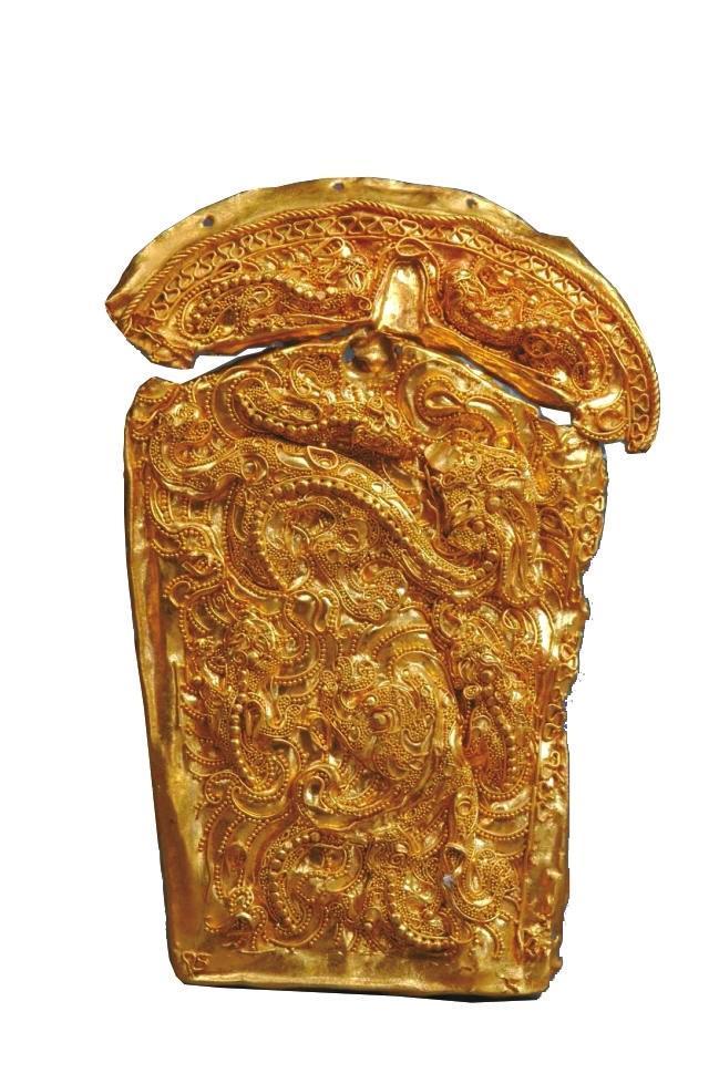 這件帶扣以黃金為質,應用多種黃金加工工藝打造而成。整件帶扣以金皮捶揲顯出七條龍的輪廓。