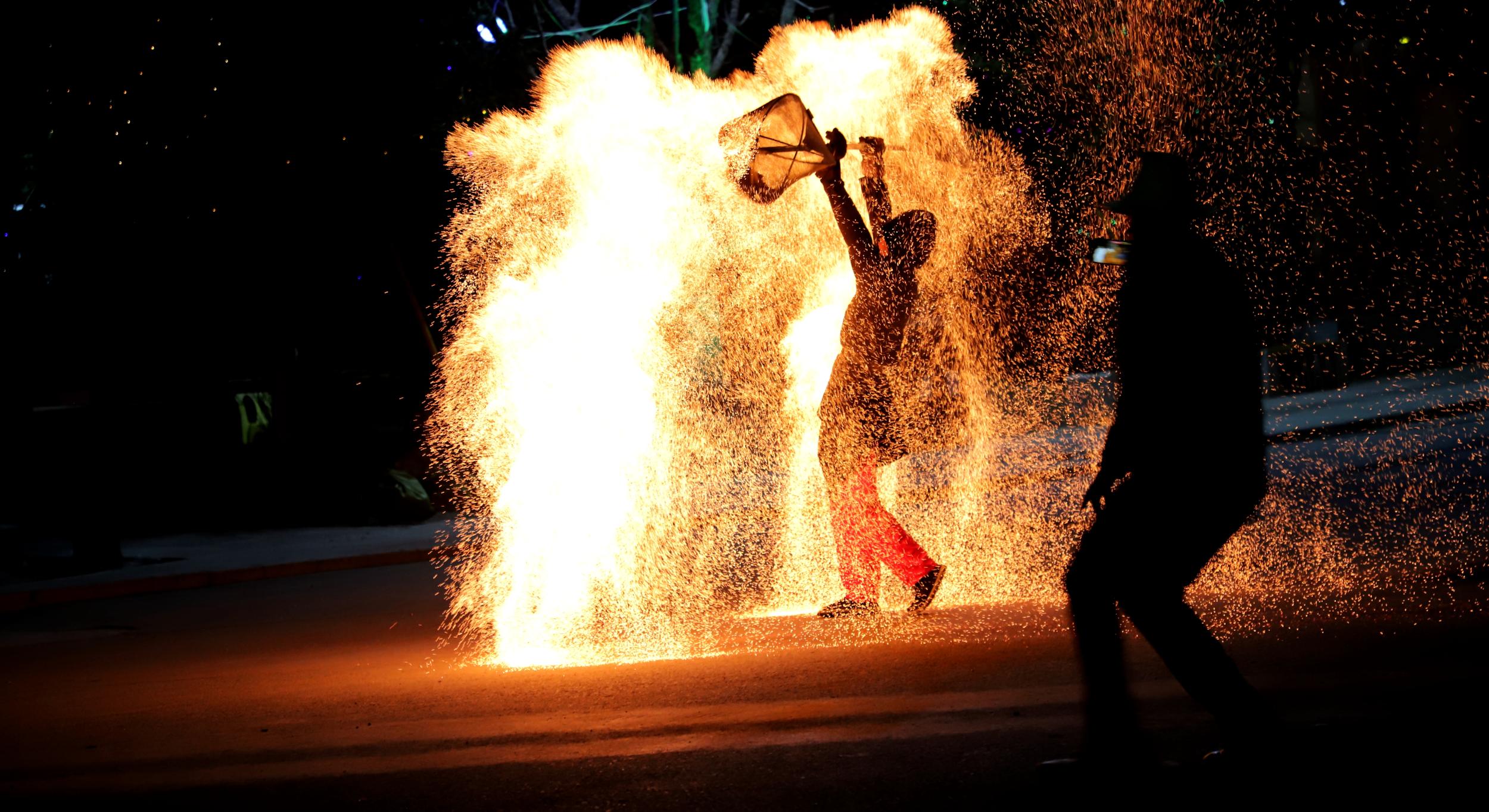 活動現(xiàn)場,鐵花飛濺,流星如瀑?,F(xiàn)場火樹銀花璀璨奪目,絢爛的鐵花在空中綻放,令人驚艷。專業(yè)打花人將近1500多攝氏度的高溫鐵汁用力擊打,化為火樹銀花,在空中形成鐵花,四處飛濺,放眼望去,一串串耀眼的鐵花在空中散開,猶如煙花綻放,又似流星滑落,繪就“鐵樹銀花落,萬點星辰開”的美景。