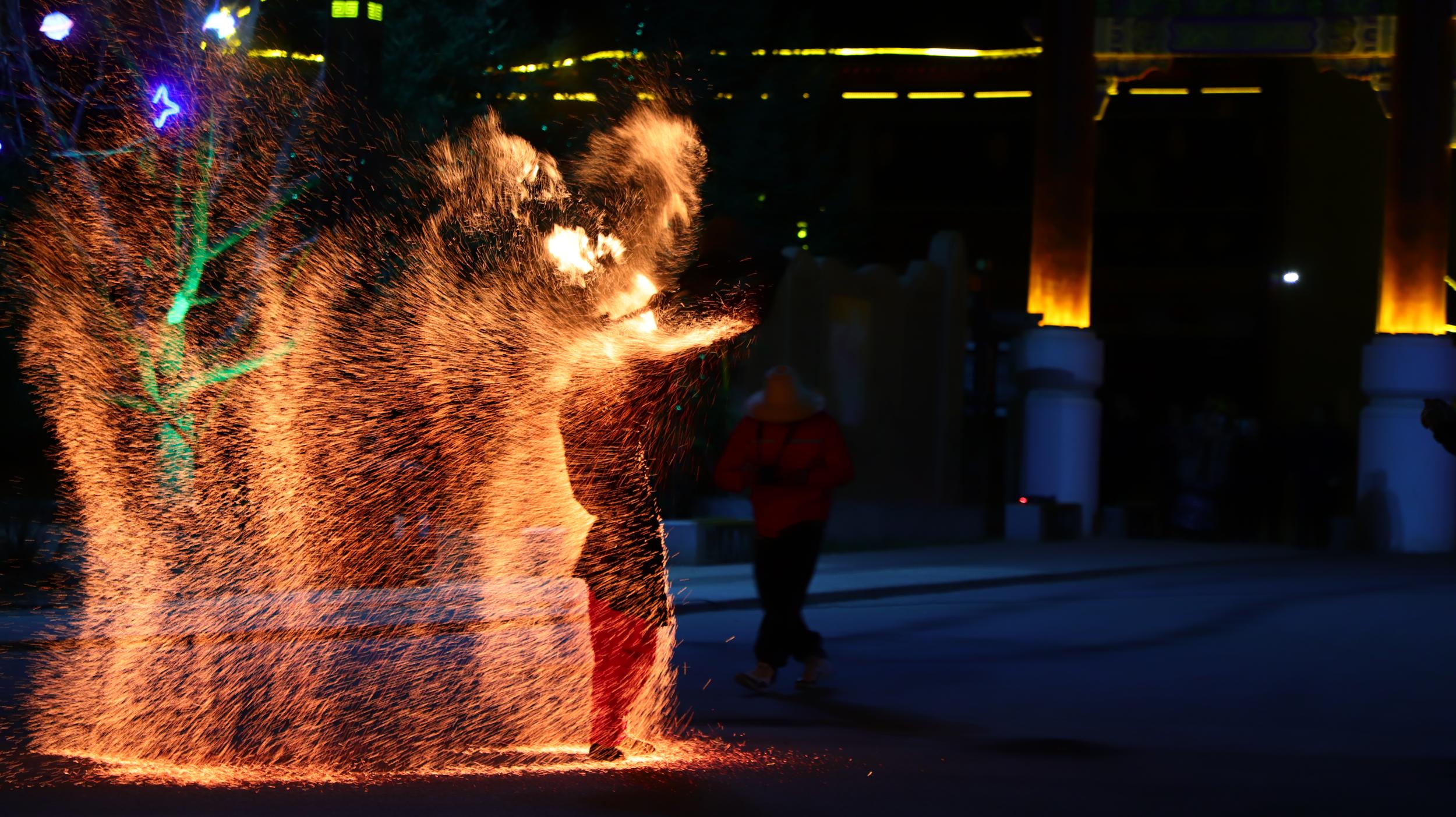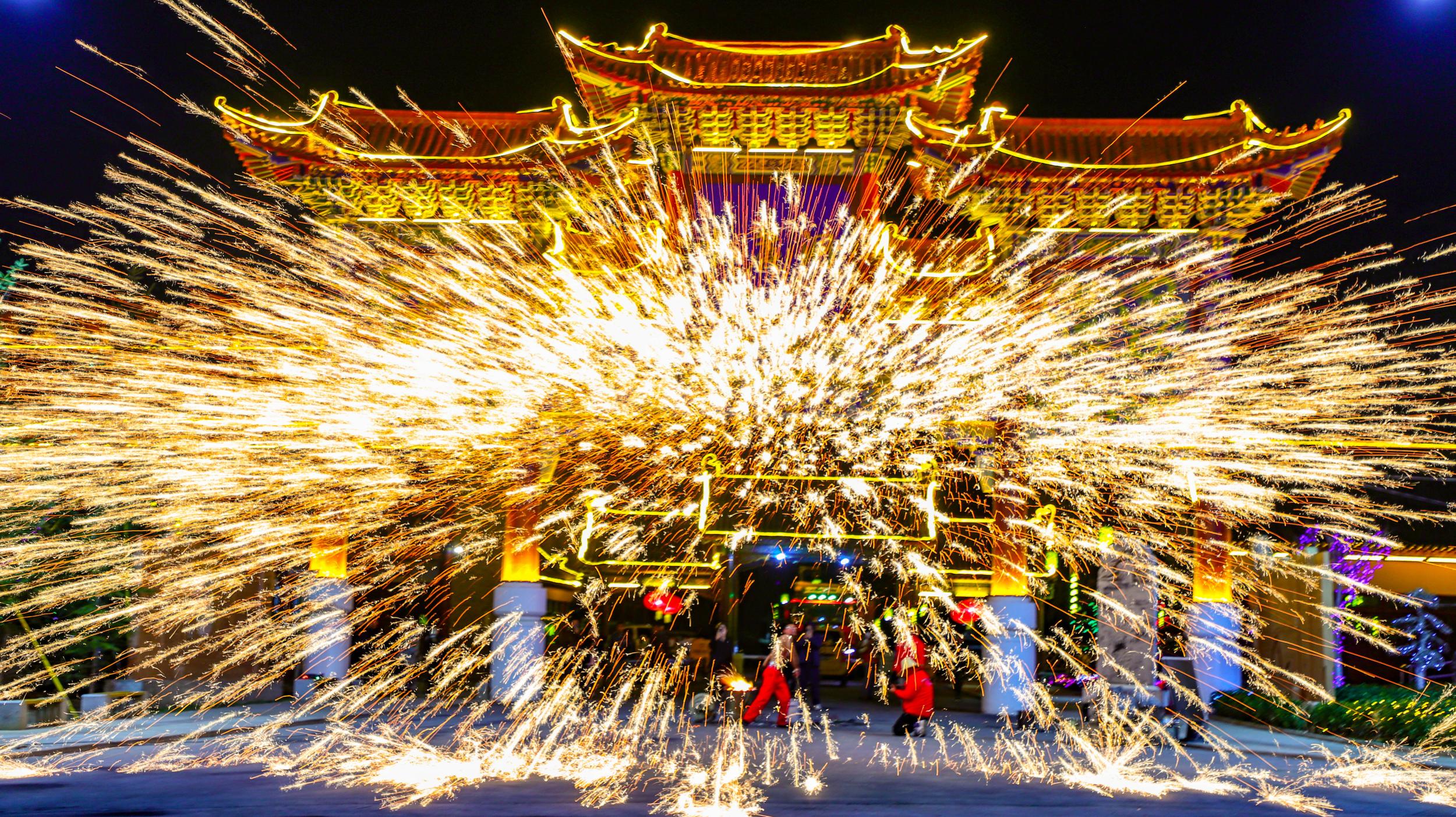 璀璨奪目的鐵花在空中綻放,場面十分壯觀。民眾在火樹銀花、星光璀璨之間感受著濃濃的中國傳統(tǒng)民俗文化。