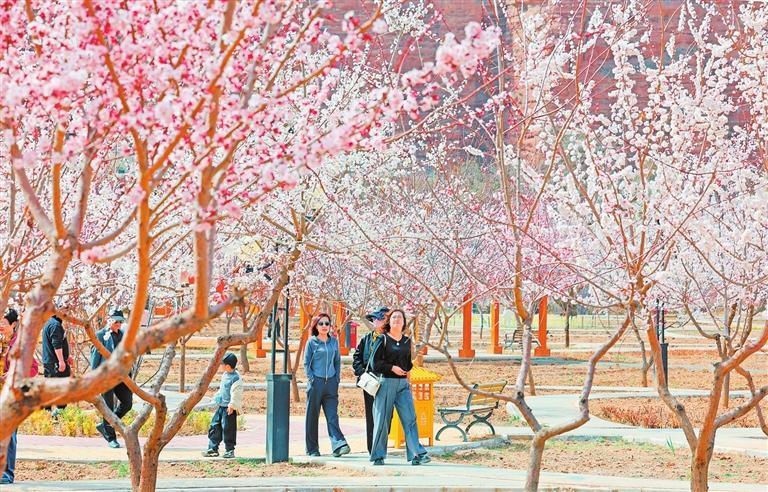 游客在“隴上杏花第一村”東鄉(xiāng)縣唐汪鎮(zhèn)河沿村賞花觀景。 新甘肅·甘肅日報記者 田蹊