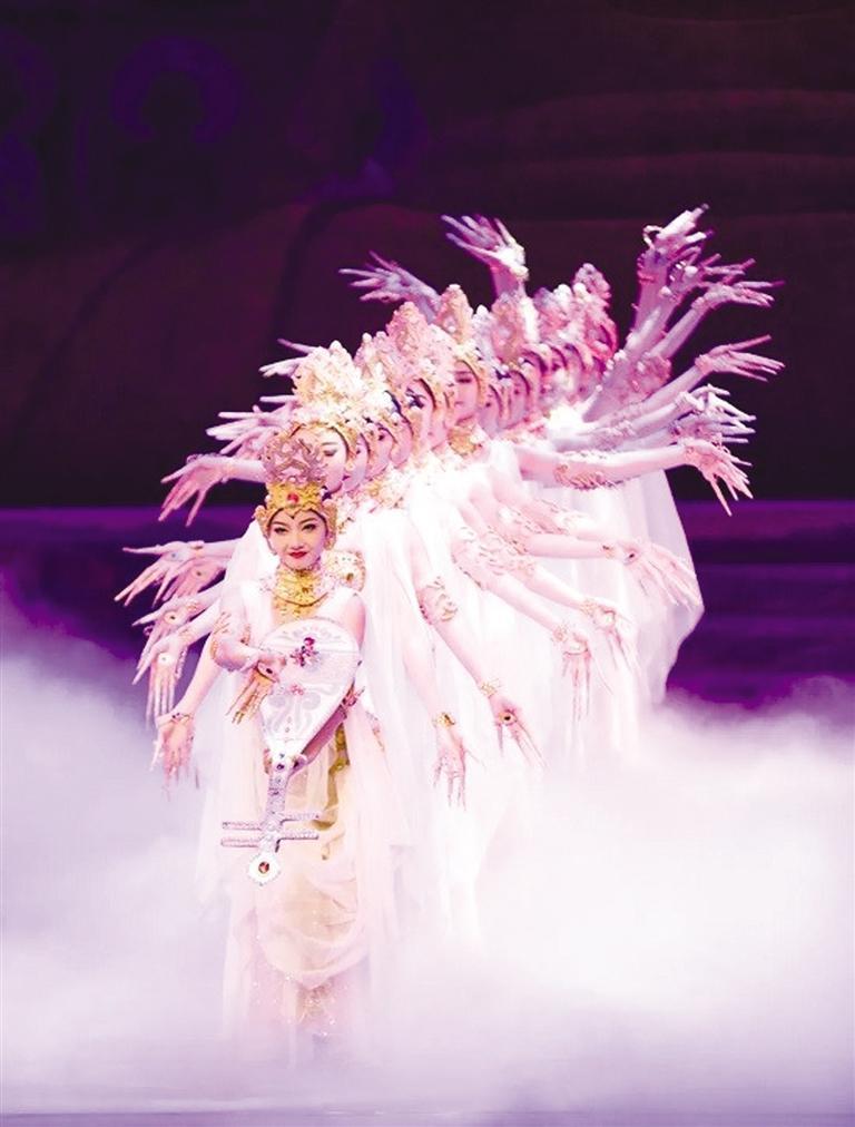 經(jīng)典舞劇《絲路花雨》歷經(jīng)45載,累計演出3952場,觀眾達(dá)537.47余萬人次,享有“中國民族舞劇的典范”“東方的《天鵝湖》”之稱。演出現(xiàn)場,劇中經(jīng)典舞蹈選段《金光千佛》《反彈琵琶》《霓裳羽衣舞》《夢幻伎樂天》為游客粉絲和廣大觀眾繽紛綻放,引發(fā)陣陣歡呼。“反彈琵琶”源自莫高窟第112窟的反彈琵琶樂舞圖,“千手觀音”還原了莫高窟元代3窟中的千手千眼觀音圖,“活著的敦煌壁畫”、獨創(chuàng)的“S”形舞姿讓游客沉浸式感受絲路文化藝術(shù)的魅力。