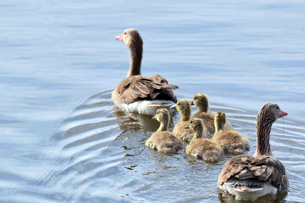 灰雁是鴨科雁屬鳥類,屬國(guó)家重點(diǎn)保護(hù)的“三有”鳥類,也是陽(yáng)關(guān)濕地的夏候鳥。監(jiān)測(cè)顯示,在陽(yáng)關(guān)濕地繁殖的灰雁家族有100多只。每年3月下旬遷飛至陽(yáng)關(guān)濕地,4月中旬筑巢繁殖,5月上旬孵化出雛鳥4至5只。灰雁為“一夫一妻”制,孵化由雌鳥單獨(dú)承擔(dān),雄鳥在巢附近負(fù)責(zé)警戒。待雛鳥破殼出窩后,則由雌雄共同撫育?;已闵阅懶 C(jī)警,小寶寶溜達(dá)時(shí),雌鳥在前開道,雄鳥負(fù)責(zé)斷后,小寶寶上岸覓食嫩草芽時(shí),雄鳥仍然負(fù)責(zé)警戒,若有危險(xiǎn)立刻鳴叫警示。故而,近距離拍攝灰雁雛鳥是比較困難的。