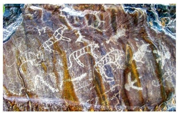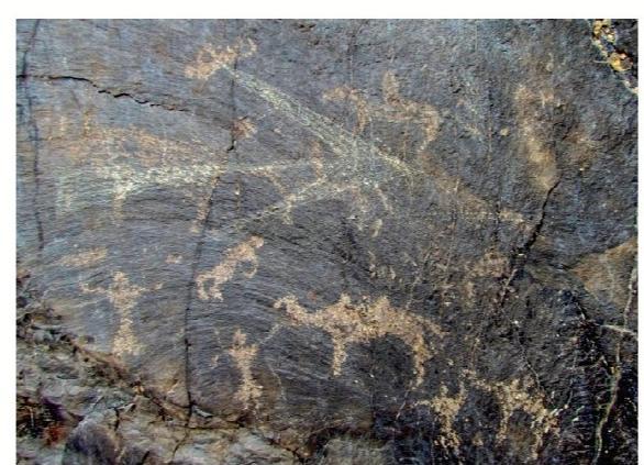 黑山巖畫全稱為“黑山摩崖淺石刻巖畫”,分布于嘉峪關(guān)西北約 10—20公里處的黑山峽谷陡崖峭壁上,為遠古時期黑山地區(qū)游牧民族生產(chǎn)、生活的真實記錄?,F(xiàn)共發(fā)現(xiàn)分布在黑山石關(guān)峽口、磨子溝、蕉蒿溝、四道股形溝、紅柳溝、交河溝六處戰(zhàn)國至明代時期的巖畫,共 157 幅。黑山巖畫反映的時限跨度大,時空關(guān)系復(fù)雜,涉及部族較多。畫面所反映的內(nèi)容豐富多彩,有動物、人物、佛塔、植物等,還有大型的操練舞蹈場景。涉及人類學(xué)、社會學(xué)、歷史學(xué)、考古學(xué)、美術(shù)學(xué)、生物學(xué)、地理學(xué)等多個學(xué)科,具有較高的研究價值。