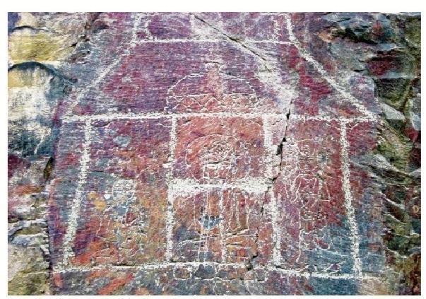 黑山巖畫中的晚期巖畫,主要反映宗教文化。紅柳溝、石關(guān)峽口巖畫中的殿堂、佛塔、佛像、古藏文題刻,可能屬于唐代中期以后的宗教遺物。藏傳佛教在 7世紀(jì)時同古藏文一起為吐蕃松贊干布創(chuàng)立。據(jù)史書記載,唐因平定“安史之亂”,河西空虛,吐蕃乘機占領(lǐng)河隴之地達 100 余年。吐蕃人居住河西,在紅柳溝、石關(guān)峽刻畫佛教殿堂、菩薩、佛像、佛塔是完全可能的。由此推斷,黑山紅柳溝、石關(guān)峽口佛塔、佛像及藏文題刻為唐中期以后的吐蕃所留。