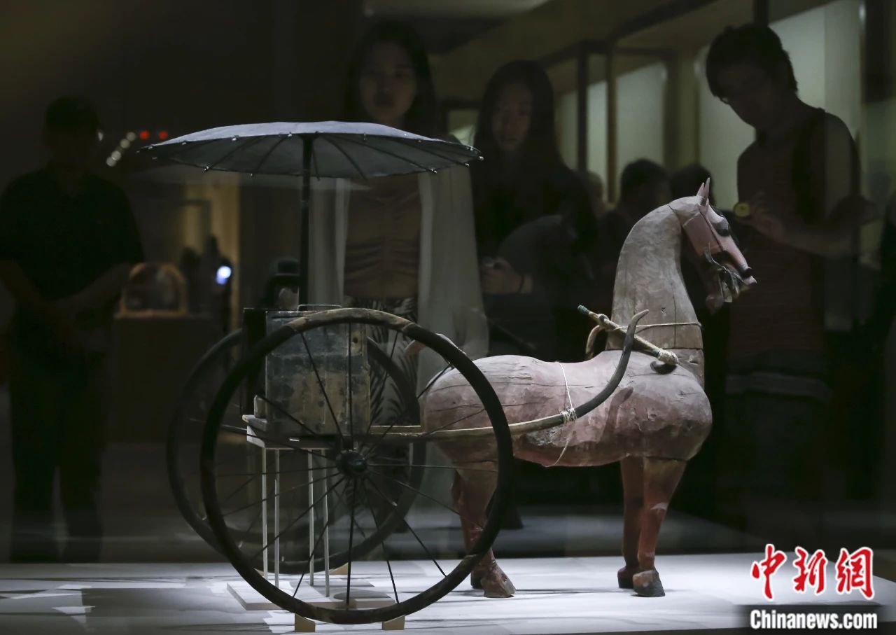 “絲路孔道——甘肅文物菁華展”在中國(guó)國(guó)家博物館舉行,展覽展出西漢彩繪木軺車。賈天勇 攝