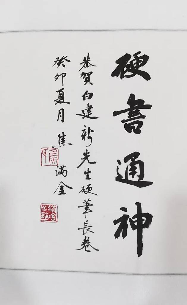甘肅省硬筆書法家協(xié)會主席焦?jié)M金先生為該長卷題詞:硬書通神