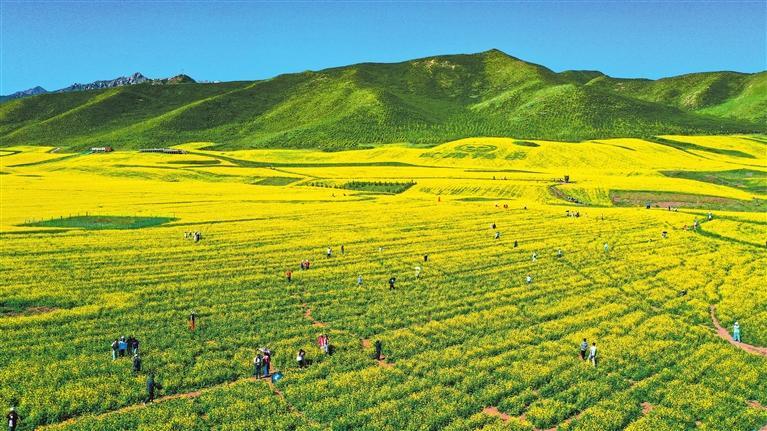 一路前行,一路風(fēng)景。一片片的油菜花開得生機(jī)勃勃,連天接地,引得游人駐足拍照。萬畝油菜花海隨風(fēng)起伏,如同時(shí)間長河里濺起的金色浪花,游人穿行于花海中,臉上都露出了孩子般的笑容,愜意而放松……