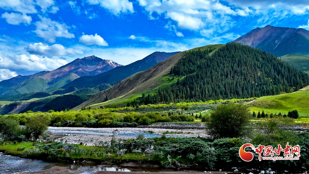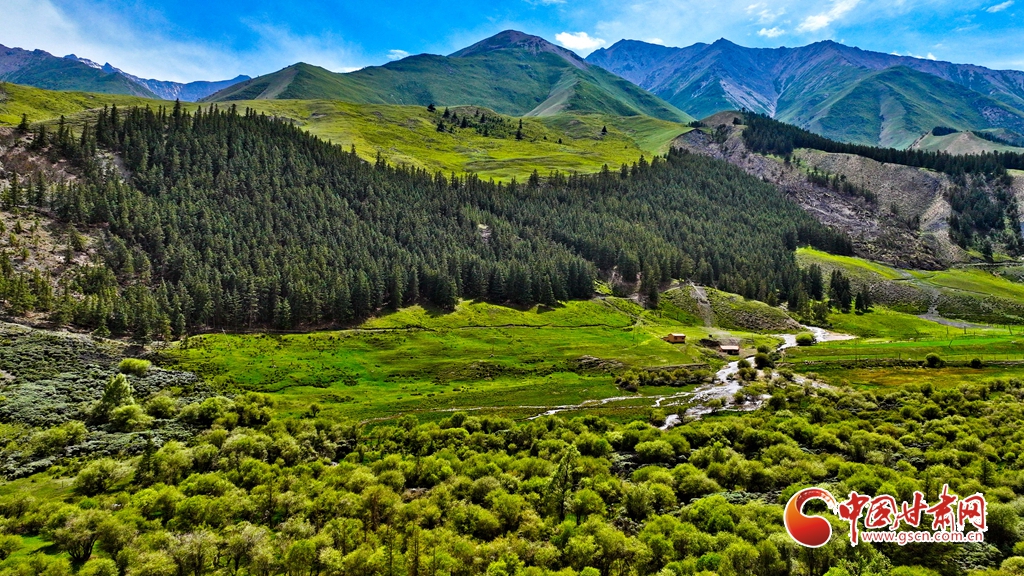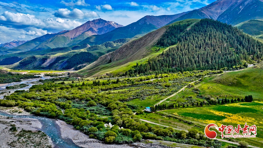 7月2日,祁連山國家公園甘肅省張掖市肅南裕固族自治縣大河鄉(xiāng)段,在高原藍天白云映襯下,群山環(huán)抱、 雪峰高聳,鳥鳴聲陣陣的濕地、奔騰不歇的黑河水、猶如“巨幅綠毯”的草原,勾勒出一幅風光壯美的生態(tài)畫卷。
