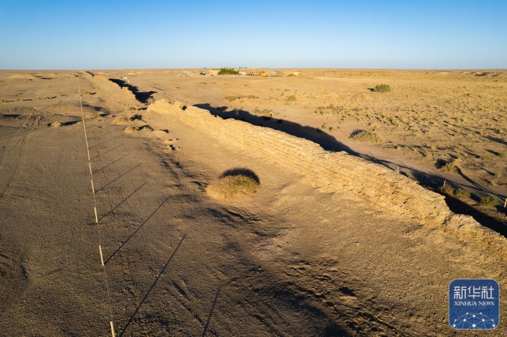 ↑這是張吉全和聞春瑜夫婦負(fù)責(zé)巡護(hù)的一段漢長(zhǎng)城遺址(7月16日攝,無(wú)人機(jī)照片)。