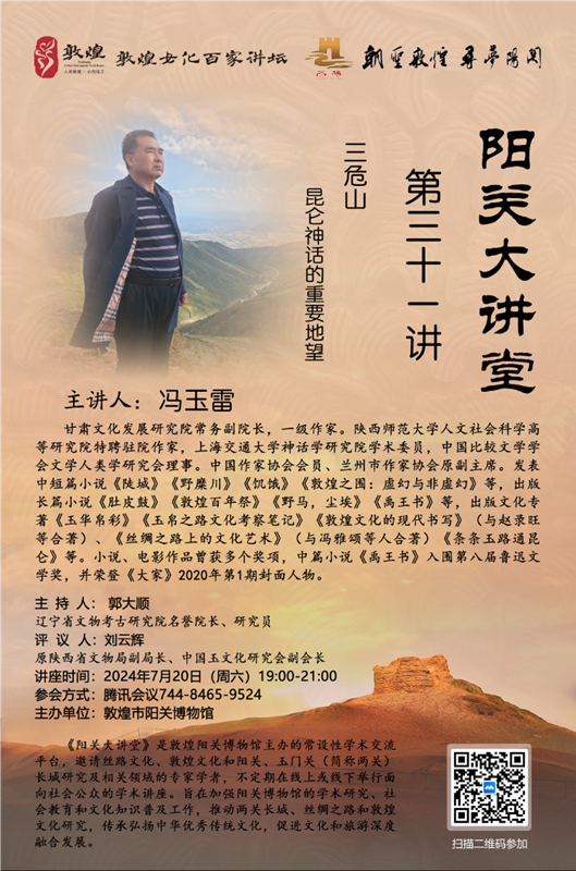 中國(guó)甘肅網(wǎng)7月18日訊 7月20日,西北師范大學(xué)甘肅文化發(fā)展研究院常務(wù)副院長(zhǎng)、一級(jí)作家、玉文化學(xué)者馮玉雷將在線進(jìn)行題為《三危山:昆侖神話的重要地望》的講座。本次講座由敦煌陽關(guān)博物館主辦,為“敦煌文化百家講壇”第31講,遼寧省文物考古研究院名譽(yù)院長(zhǎng)、資深考古學(xué)家、玉學(xué)家郭大順研究員擔(dān)綱主持,陜西省文物局原副局長(zhǎng)、中國(guó)玉文化研究會(huì)副會(huì)長(zhǎng)、資深玉學(xué)家劉云輝教授擔(dān)綱評(píng)議。